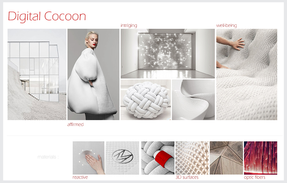 Technologic & connected, the Digital Cocoon trend answers a need of physical comfort and high technologies. Generous, expansive, with a refined color palette, it’s a mix of soft and dynamic.